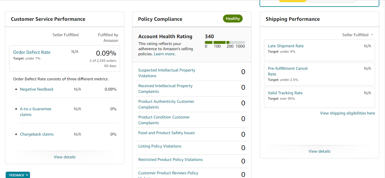1. Order Defect Rate (ODR): Reflects orders with defects, such as negative feedback, A-to-Z claims, or credit card chargebacks. Your ODR should always be below 1%; exceeding this limit can result in suspension.
