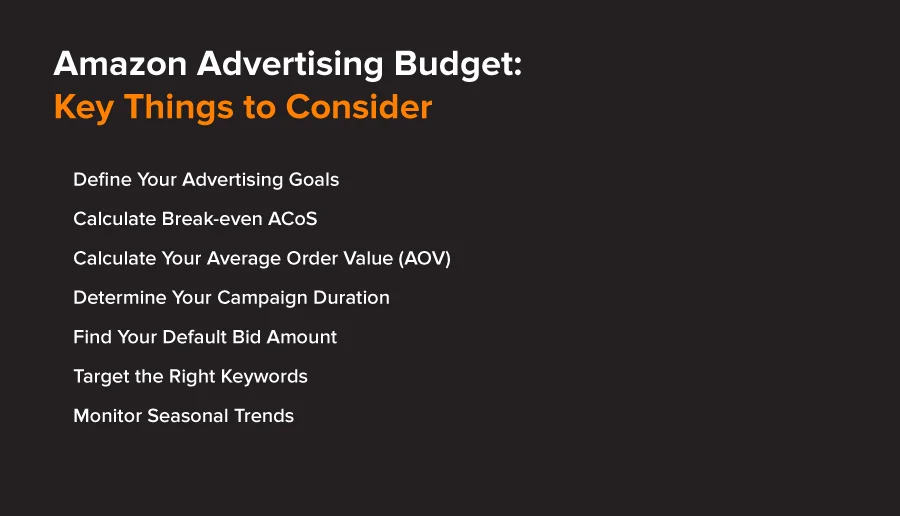 Key factors like determining your overall advertising goals, calculating break-even ACoS, identifying default bid amounts, and monitoring seasonal trends help you allocate your marketing budget effectively.