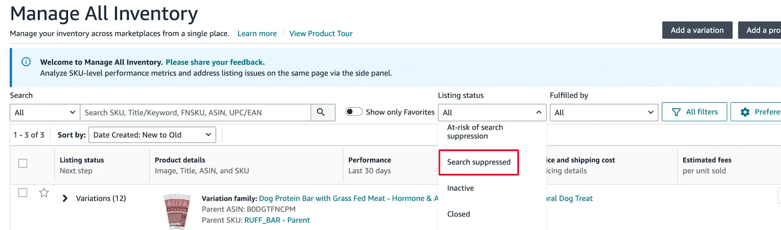 How You Know: You’ll usually get an email from Amazon explaining that your ASIN or SKU has been suppressed. The suppression will also be marked by a red block in Seller Central.