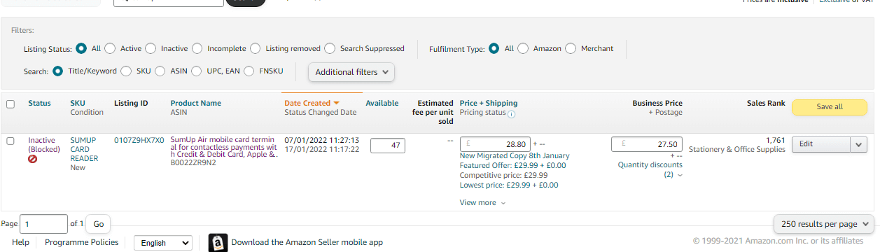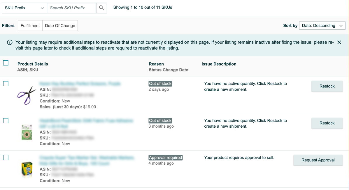 Some listings are blocked because the item is restricted, recalled, or prohibited. Seller Central will show either a red icon (cannot relist) or a yellow icon (can relist after fixing issues). Click the link next to the icon to see what actions are needed.