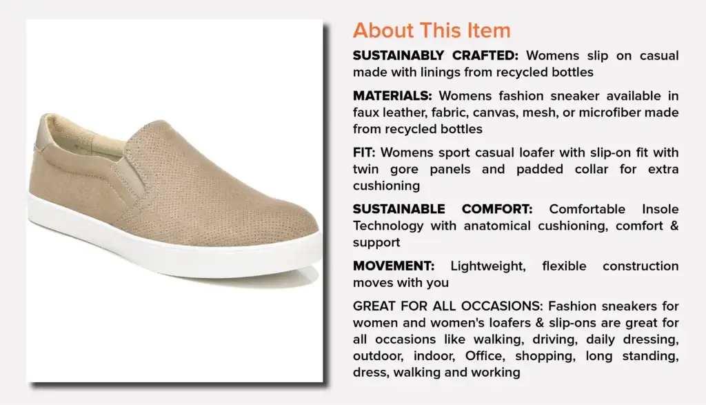 Following is an Amazon product description sample for a women’s sneaker highlighting the key features and benefits: