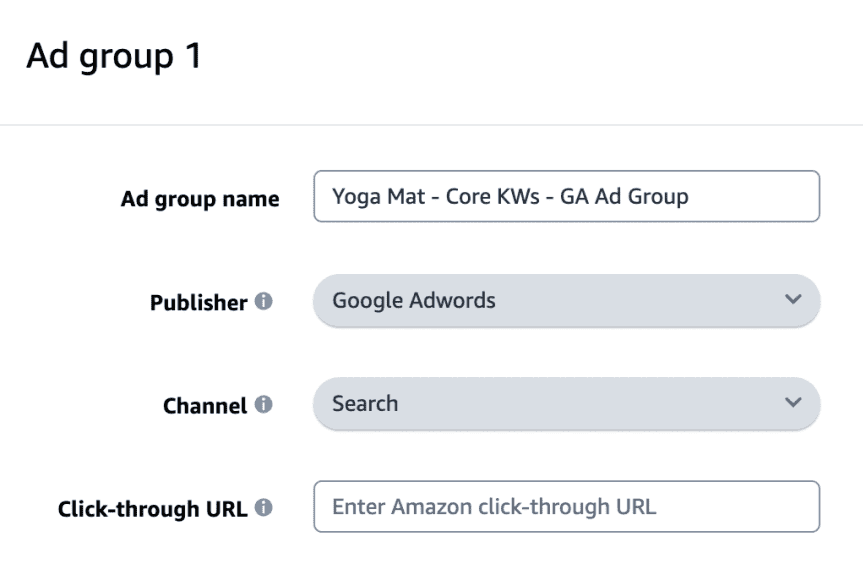 Set up one ad group for each strategy, tactic, or creative. For example, create one ad group for a Google Ads campaign and another for a paid Amazon Facebook Ads campaign. Each ad group creates a unique attribution tag to track conversions for your selected products.