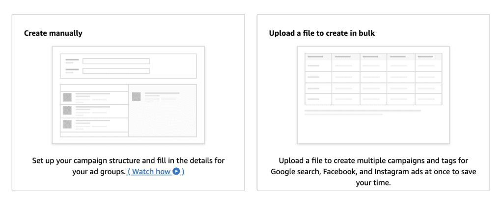 Try the bulk upload feature. Use it if you run Google search, Amazon Facebook Ads, or Instagram campaigns to add tags and track up to 100,000 Google keywords or 8,500 Facebook or Instagram ads with one file. The Amazon Attribution API can help make this process even easier for you.