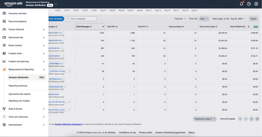 - Accurate Campaign Tracking: Whether you’re spending on Amazon ads or other platforms, Amazon Attribution helps you figure out what’s working. The data shows exactly which campaigns and keywords are bringing in results.
