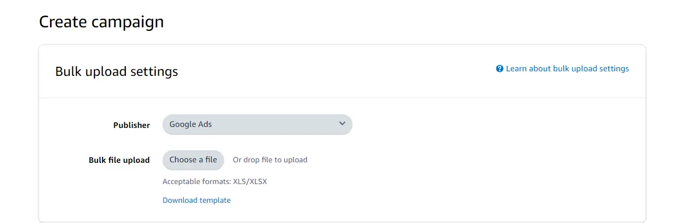 In the “Bulk upload settings” section, select Google or Facebook/Instagram under “Publisher,” and download the bulk file template.