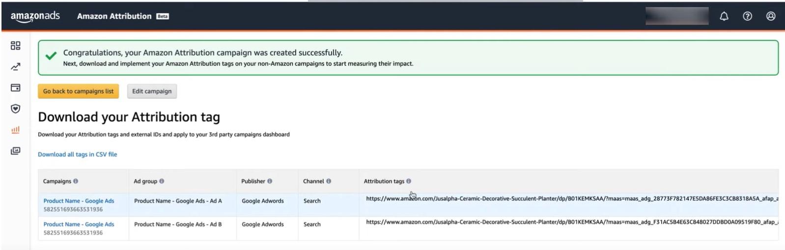 To finish setup, apply the attribution tags to your campaigns in the platform’s campaign manager, such as a social media site’s ad manager for Amazon social networking campaigns.